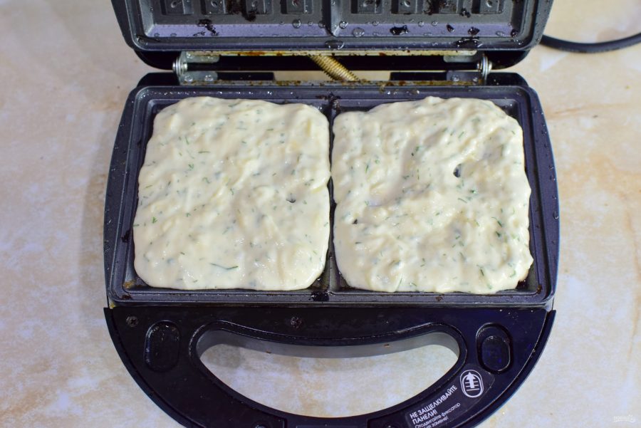 Затем напеките сырные вафли. Тесто распределяйте по всей вафельнице, чтобы в итоге получить целые вафли.