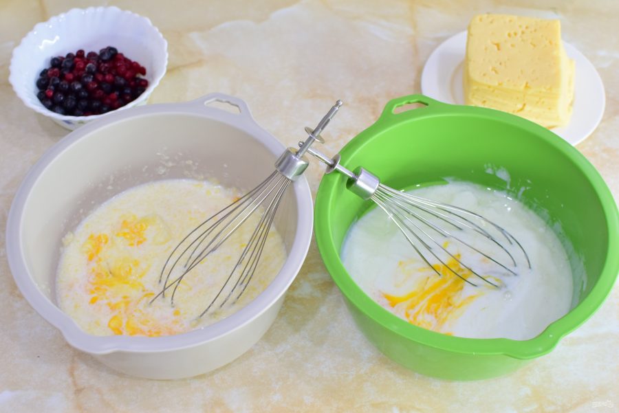 А в тесто на кефире добавьте тертый сыр и измельченную зелень. Перемешайте оба вида теста.