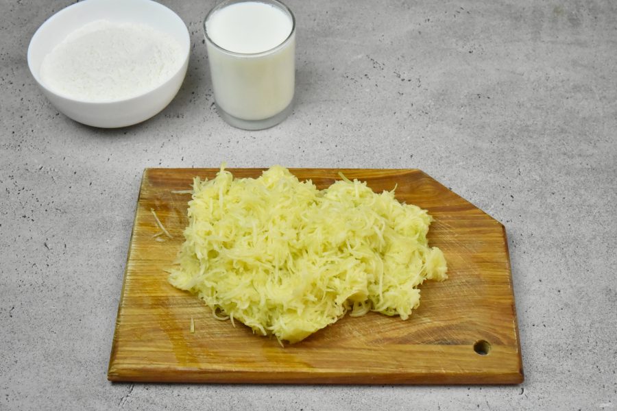 Кабачок натрите на мелкой терке, посолите и оставьте на пару минут, чтобы выделилась влага. Хорошенько отожмите мякоть и переложите в чистую сухую посуду.