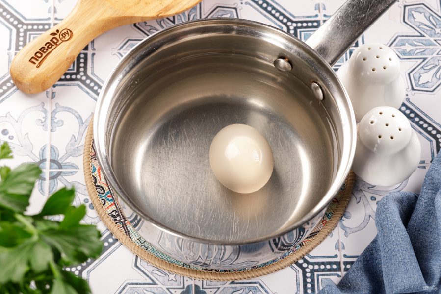 Вскипятите воду в кастрюле. Воду посолите – 2 столовые ложки на литр. Даже если яйцо треснет, белок не вытечет. Осторожно опустите яйцо в кипящую воду. Нельзя класть холодные яйца в кипяток. Нагрейте их до комнатной температуры, предварительно выложив их из холодильника на час. Или подогревайте в тёплой воде. Варите на максимальном огне без крышки.