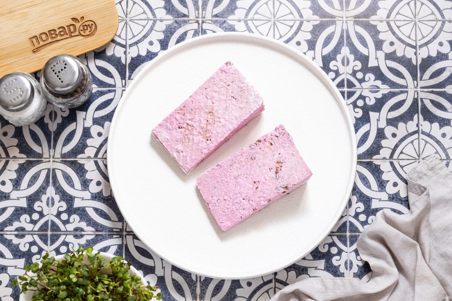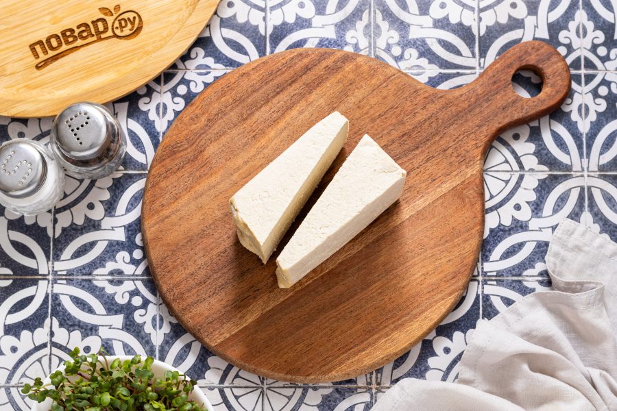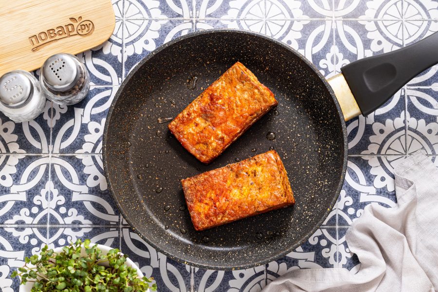 Разрежьте тофу по диагонали, чтобы получилось два треугольных кусочка. По необходимости придайте им большее сходство со стейком лосося. Я после обрезала кусочки, чтобы они были не такими широкими.