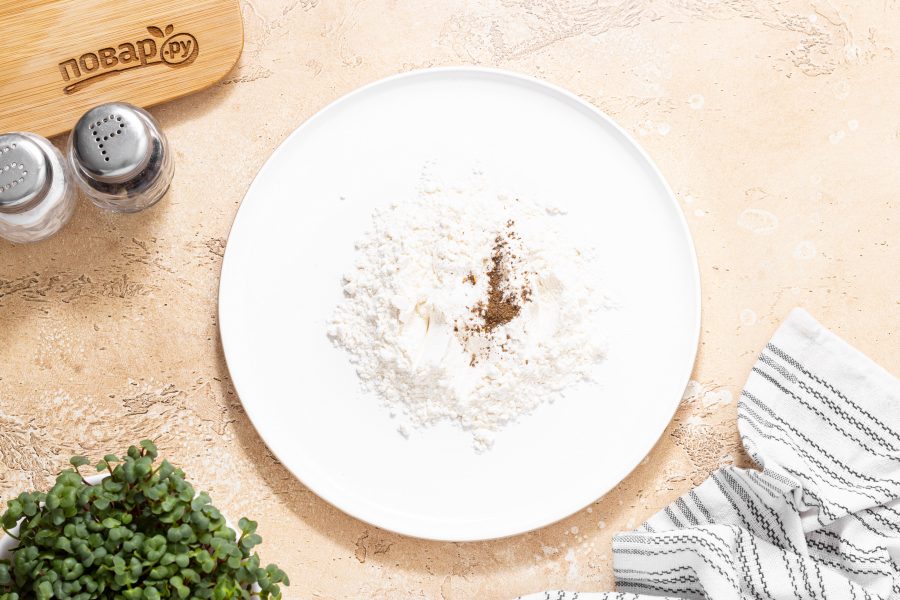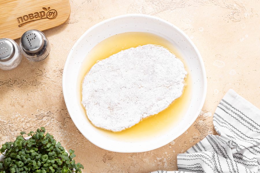 Обваляйте шницели в муке с двух сторон. Тщательно прижимайте шницели, чтобы они равномерно покрылись мукой.