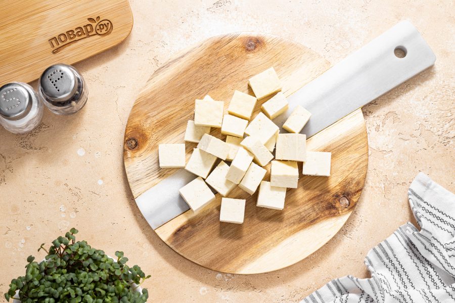 В начале нужно приготовить сами шницели. Тофу промокните бумажными салфетками, чтобы убрать лишнюю воду. Нарежьте кубиками.