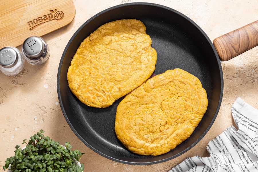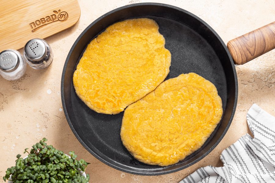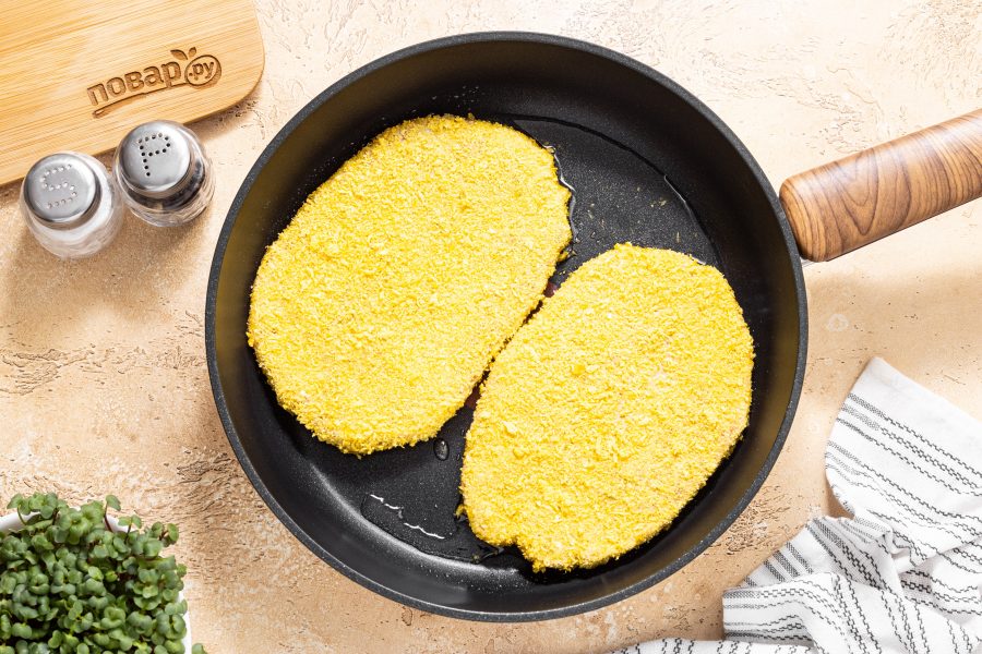 Разогрейте сковороду с капелькой масла на среднем огне. Выложите шницели и обжарьте их до совсем легкой румяной корочки с обеих сторон. Во время жарки придавливайте шницели лопаткой, чтобы форма лучше схватилась.