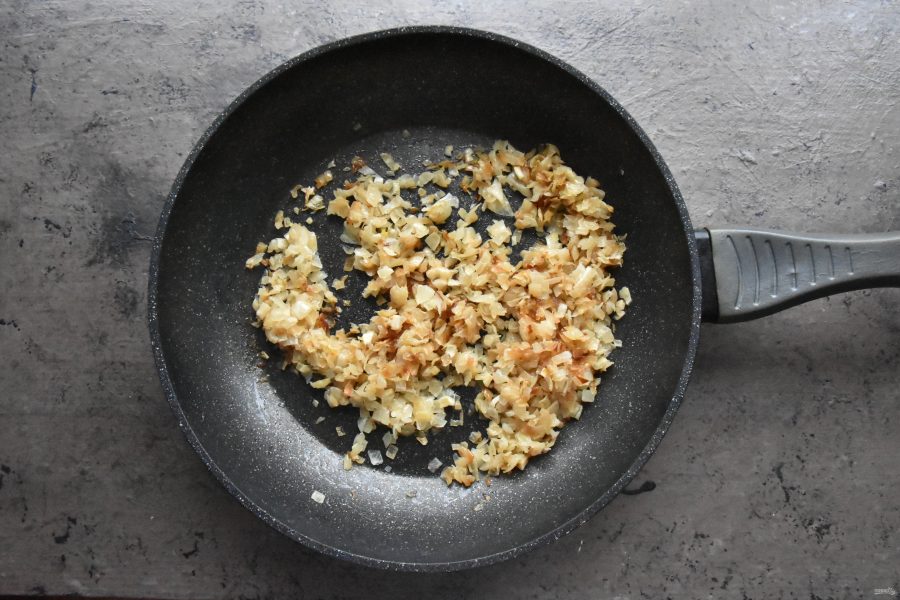 Луковицы очистите от шелухи и нарежьте мелким кубиком. В сковороде разогрейте 1 ст.л. растительного масла, добавьте подготовленный лук. Пассеруйте его до мягкости и прозрачности, периодически перемешивая.