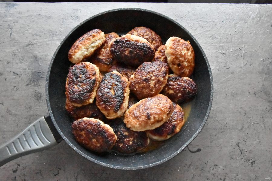 Готовые котлеты выложите в сковороду, добавьте немного воды и накройте крышкой. Потомите котлеты на медленном огне минут 5. Довести до готовности котлеты можно и в духовке.