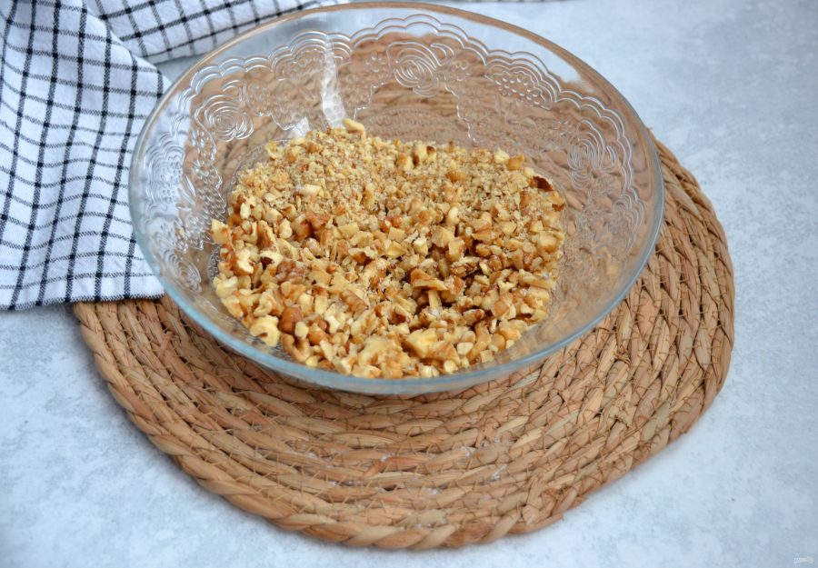 Промойте в горячей воде курагу или ополосните ее кипятком, измельчите ножом, добавьте к ореховой крошке.