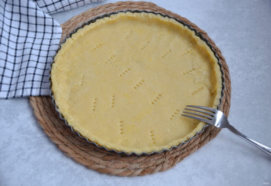 Раскатайте тесто в пласт под размер формы. Это удобно сделать между двух листов пергамента, или присыпав скалку и поверхность стола мукой.