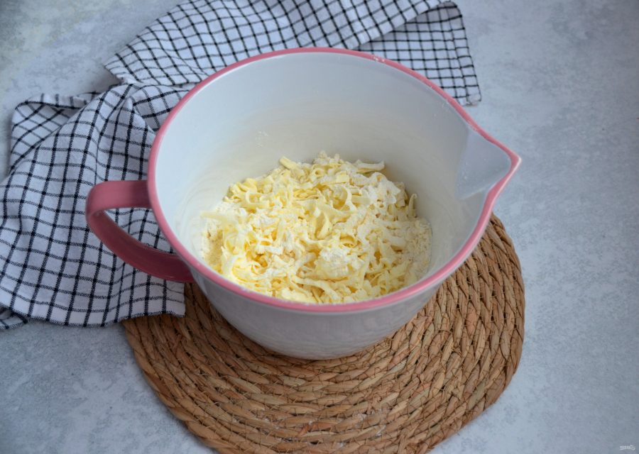 Добавьте в мучную смесь холодное сливочное масло, перетрите его в крошку с мукой. Для удобства можно натереть масло на терке, окуная время от времени кусочек масла в муку.