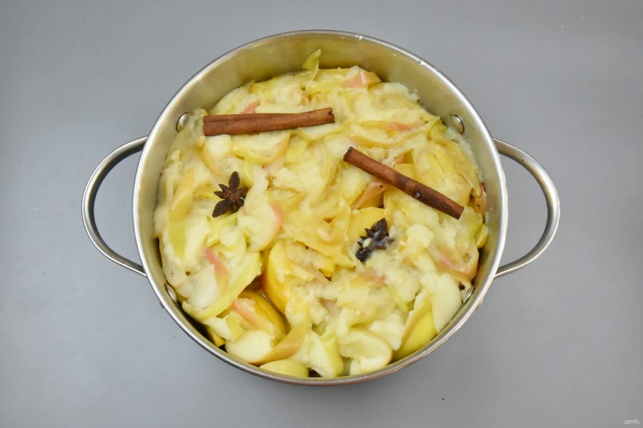 Поставьте посуду с яблоками на огонь, накройте крышкой и варите до полного размягчения яблочных долек. В процессе томления масса осядет и уменьшится в объеме.