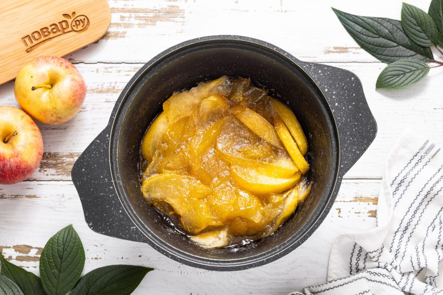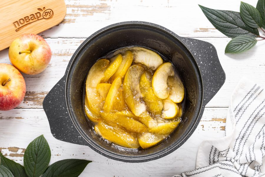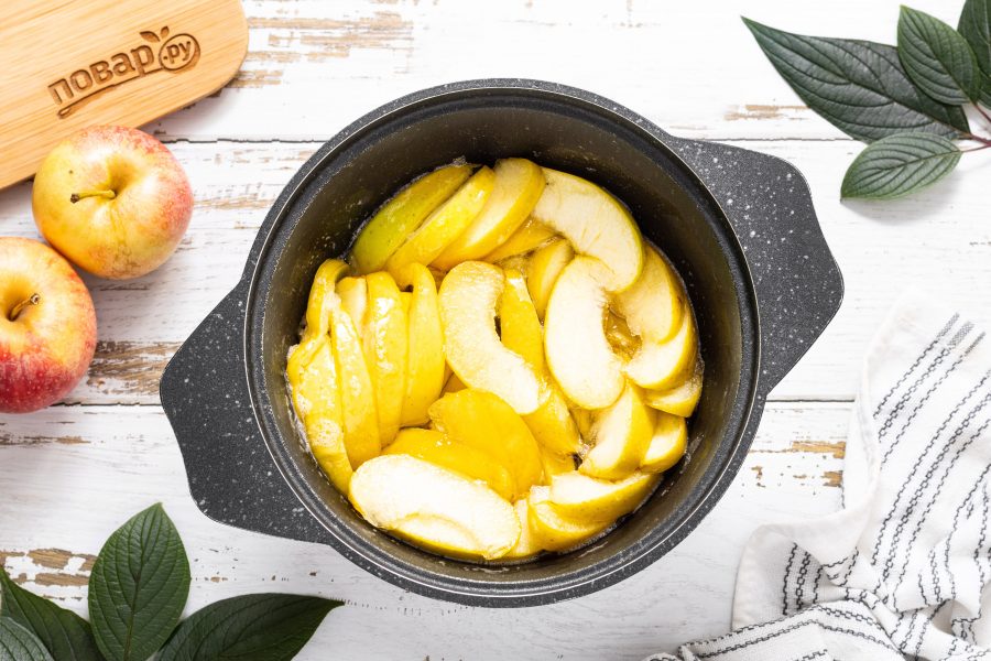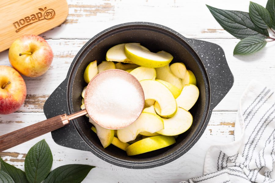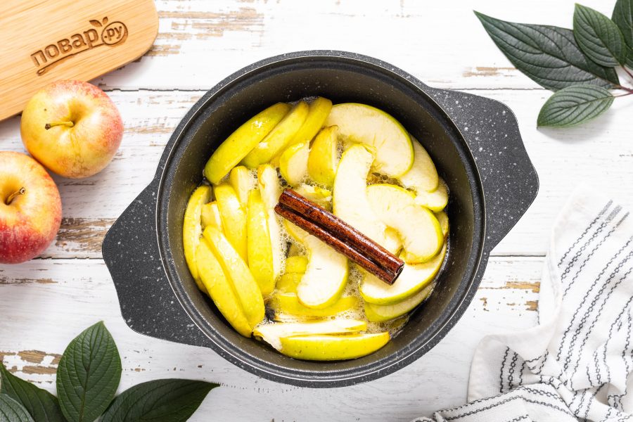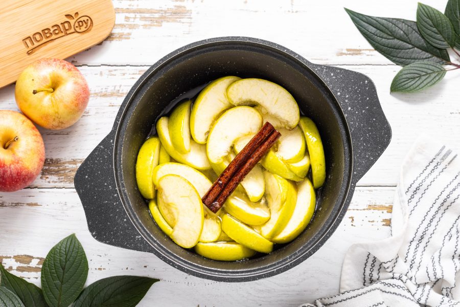 Переложите в кастрюлю, добавьте сахар. Аккуратно перемешайте, добавьте палочку корицы. Оставьте на пару часов, пока яблоки не пустят сок и не растворят сахар.