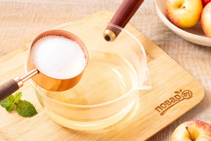 После слейте жидкость в мерную емкость и измерьте точное количество жидкости. На 500 мл. потребуется 200 грамм сахара. Перелейте жидкость в ковшик или кастрюлю, добавьте сахар и доведите до кипения. Проварите, чтобы сахар полностью растворился.