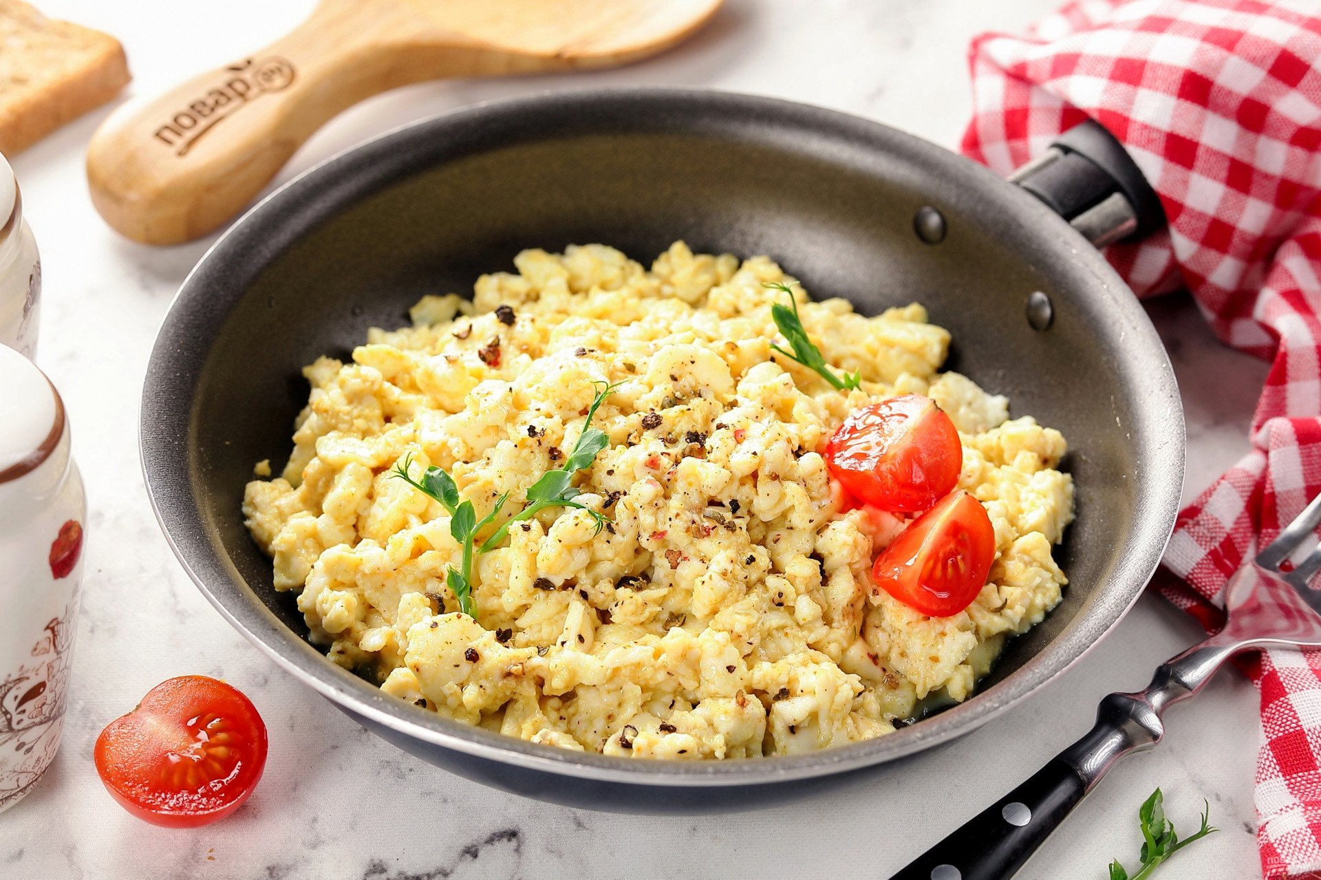 Подчеркиваю: правильно добавлять воду, а не молоко! С молоком тоже вкусно получится, но это уже будет омлет, а не яичница-болтунья.