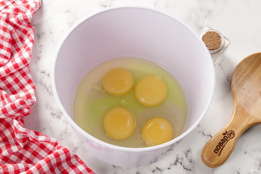 Пока масло разогревается, в глубокую миску разбейте яйца.