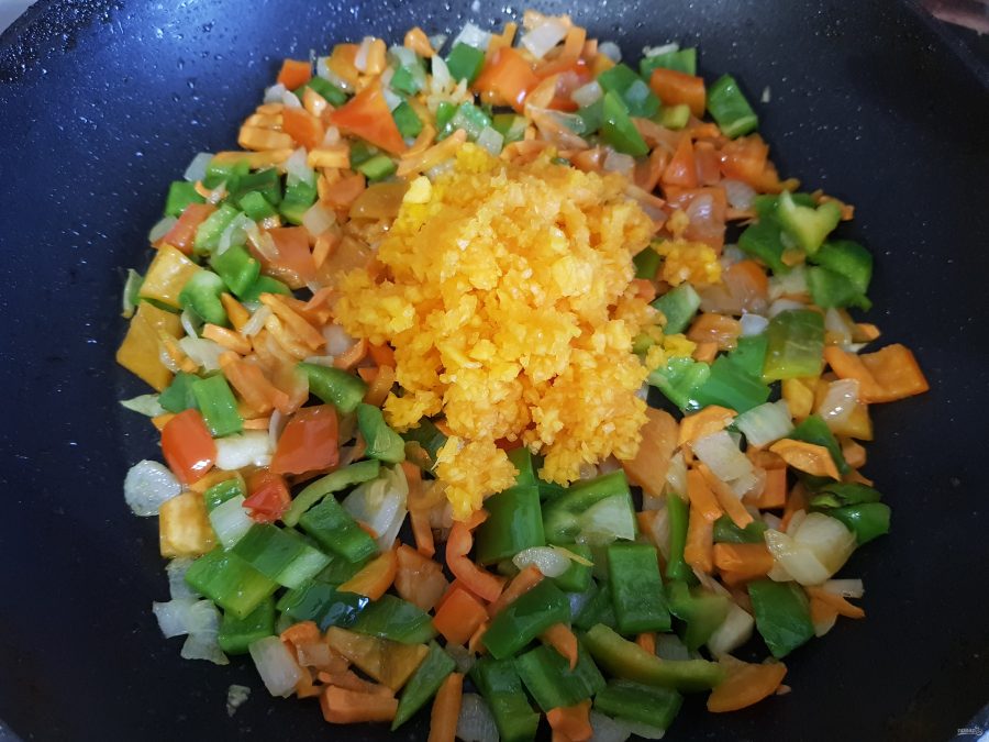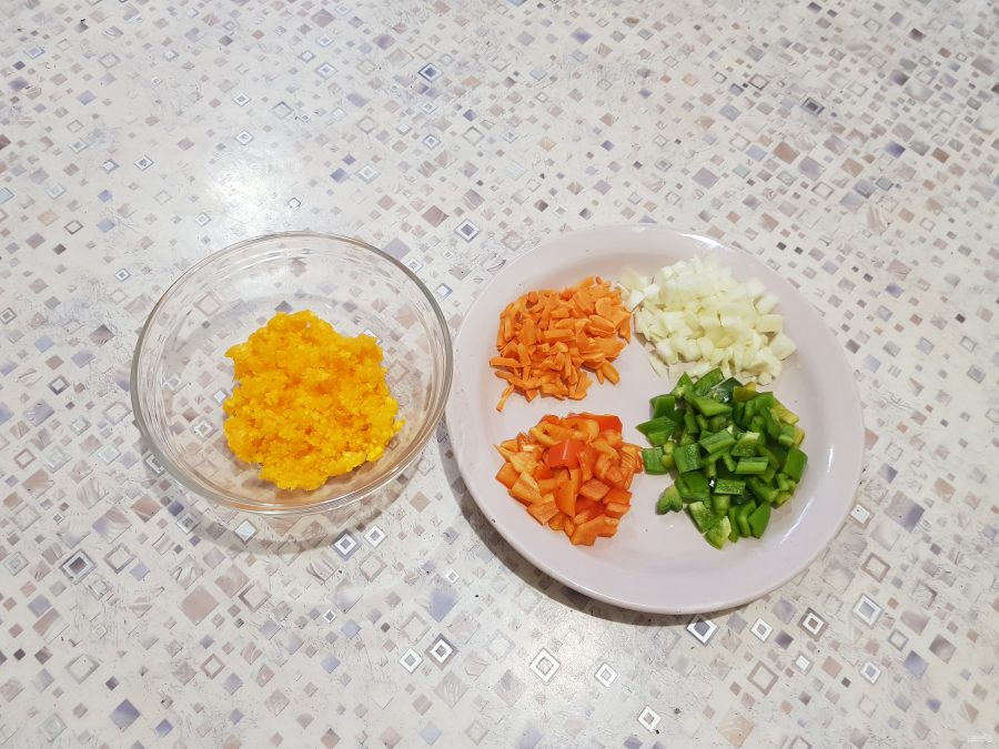 Порежьте перец, морковь и лук кубиками, тыкву натрите на мелкой тёрке.