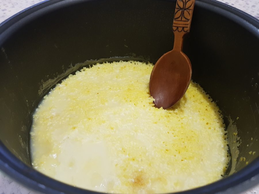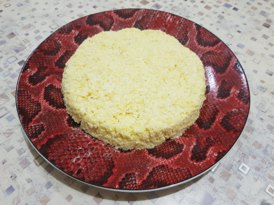Поленту необходимо выложить на блюдо в форме круга высотой 2 сантиметра и оставить остывать.