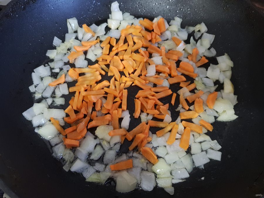 В сковороду добавьте морковь и обжаривайте ещё в течение 5 минут.