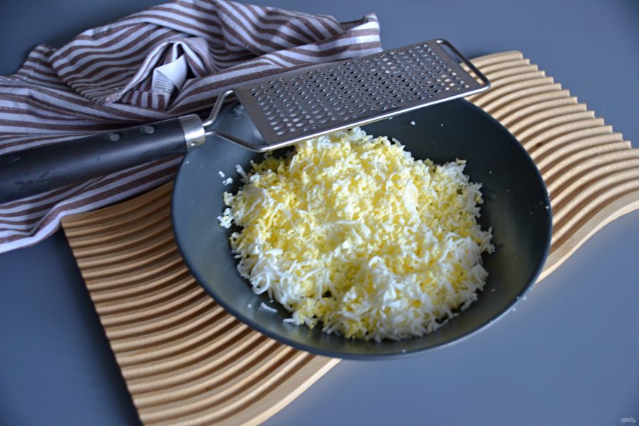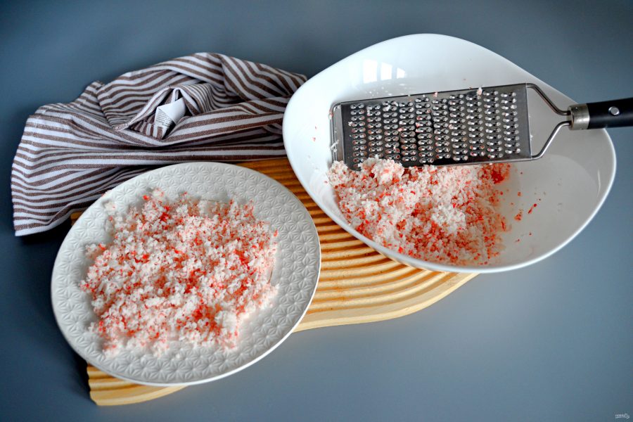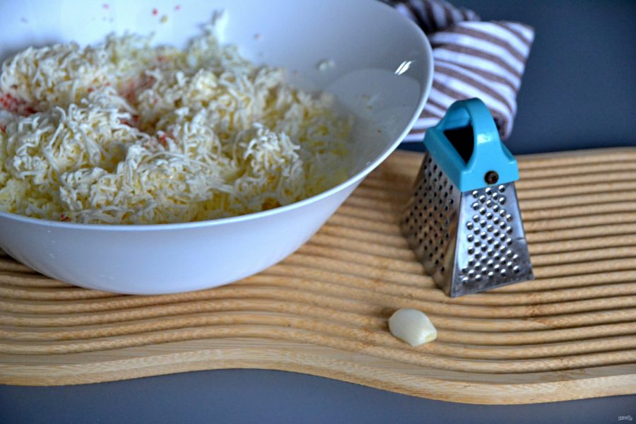 На мелкой терке натрите крабовые палочки, примерно треть натертых крабовых палочек отставьте в сторону.