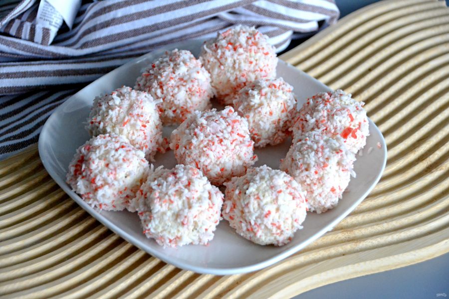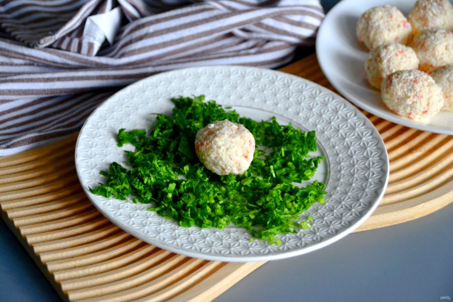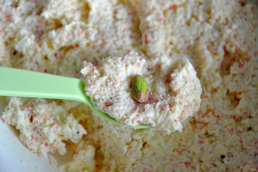 Добавьте в общую массу майонез, добавляйте частями, до тех пор, пока масса не станет необходимой консистенции, чтобы из нее можно было слепить шарики.