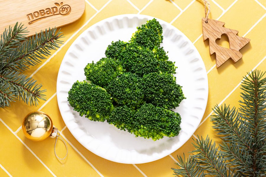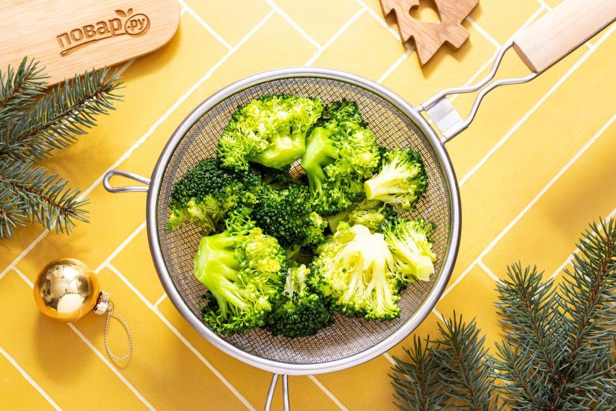 Для первого варианта елочки разделите брокколи на соцветия. Отварите в кипящей воде 2-3 минуты, затем сразу опустите в холодную воду, чтобы сохранить яркий зеленый цвет. Откиньте на сито и дайте стечь лишней воде.