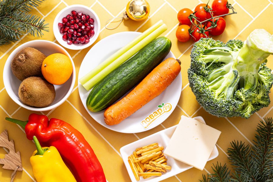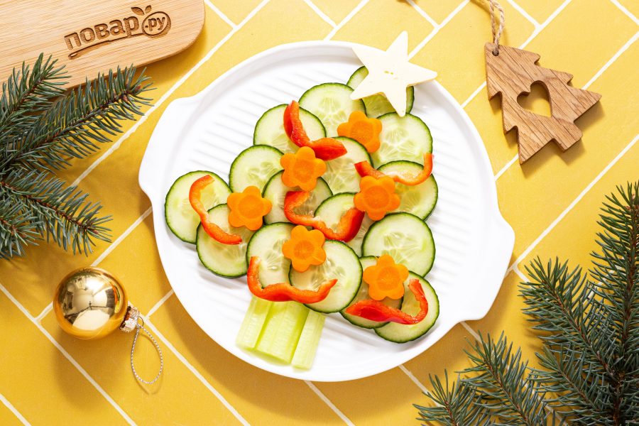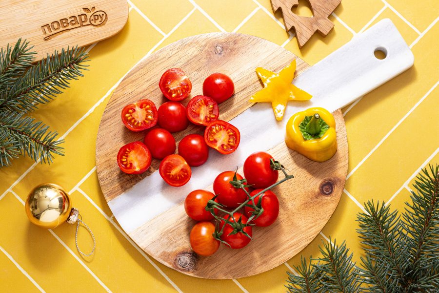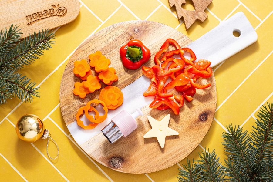 Из сыра вырежьте звезду для украшения. Морковь очистите от кожуры, нарежьте на кружочки средней толщины и с помощью формочки для канапе сделайте цветочки. Болгарский перец нарежьте полукольцами, удалите семена.