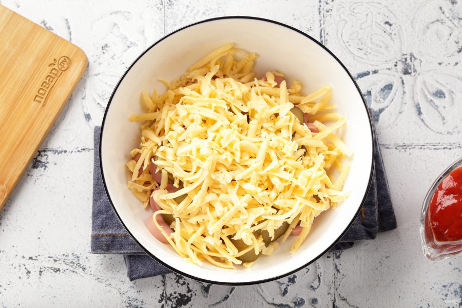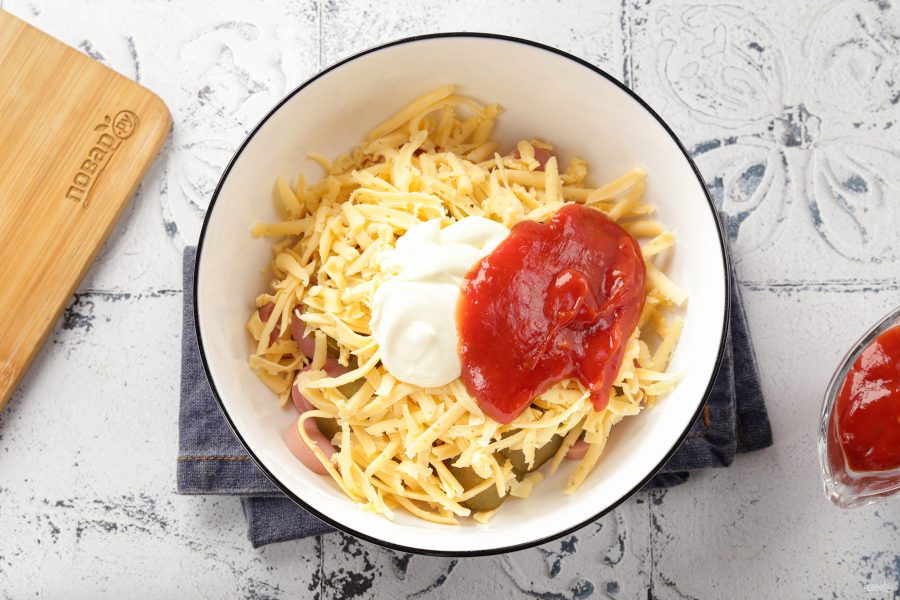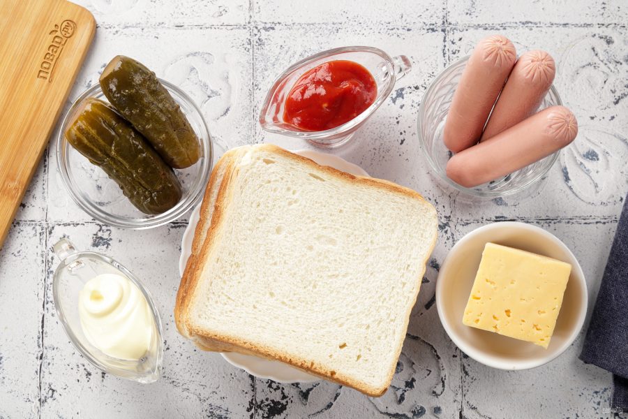 Подготовьте все ингредиенты по списку. Хлеб берите тот, что вам больше нравится. Сосиски должны быть вкусные и качественные. Сыр подойдёт любой, который хорошо плавится.