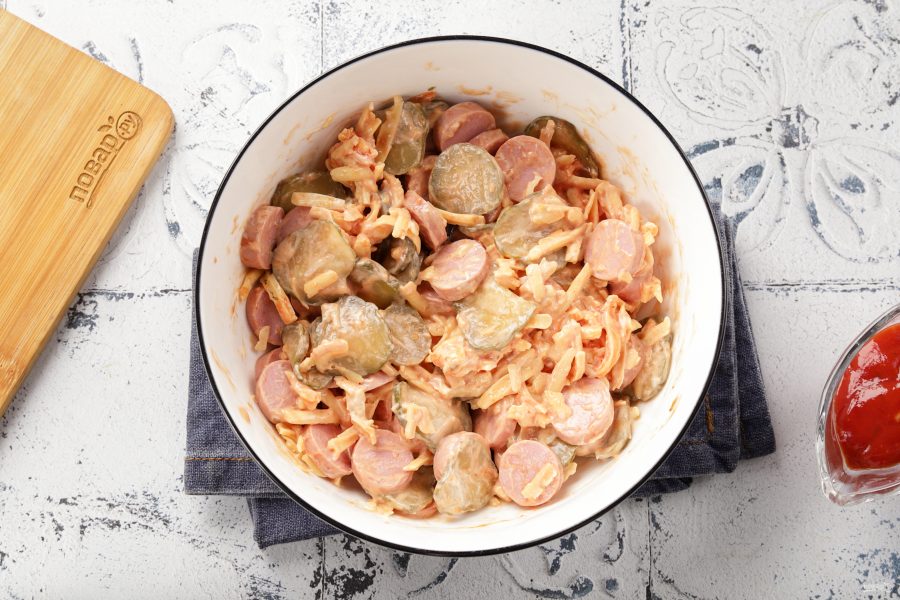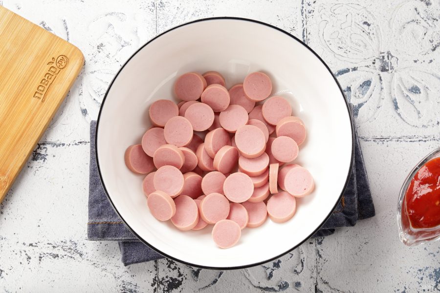 Сосиски нарежьте кружочками и переложите в глубокую миску.