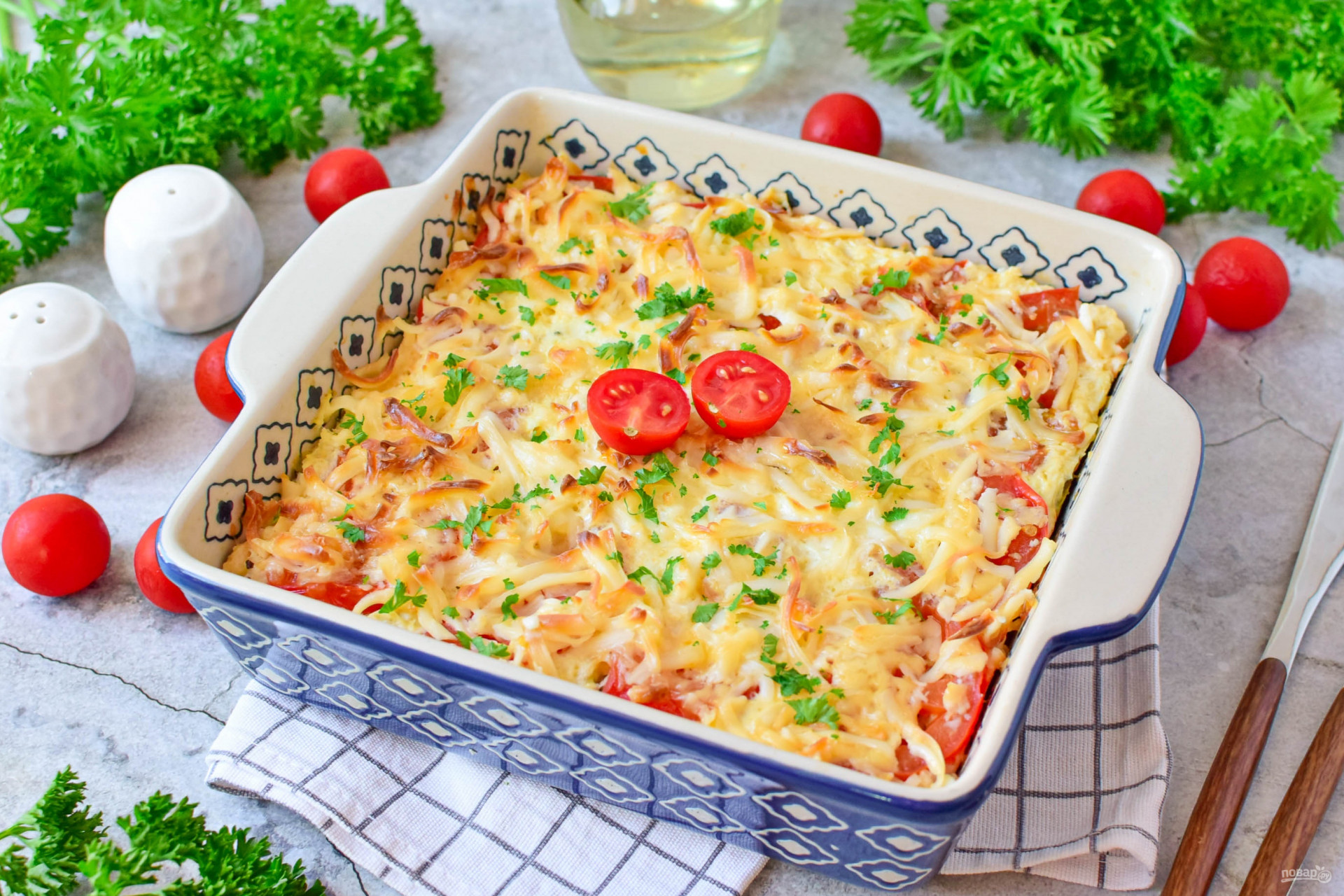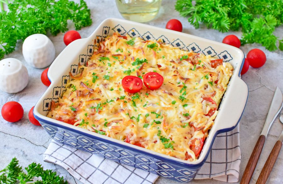 Форму для запекания смажьте растительным маслом и выложите все в форму. Сверху выложите нарезанные помидоры.
