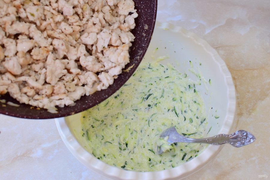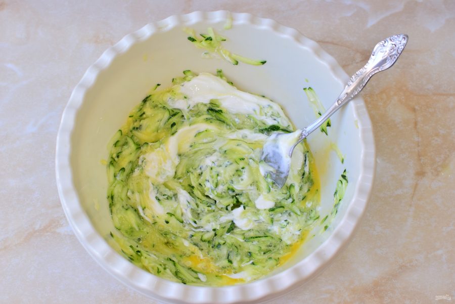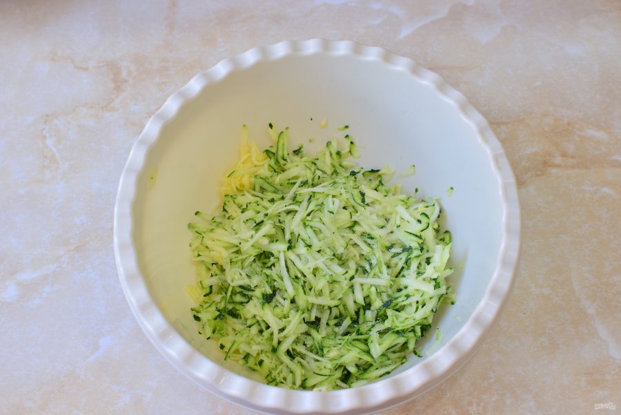 Кабачок потрите на крупной терке, посыпьте солью и оставьте немного постоять, чтобы они пустили сок. Затем этот сок отожмите.