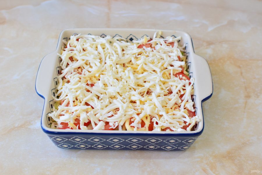 Обильно посыпьте запеканку тертым сыром. Поставьте в духовку, предварительно разогретую до 180 градусов, примерно на 30-40 минут.