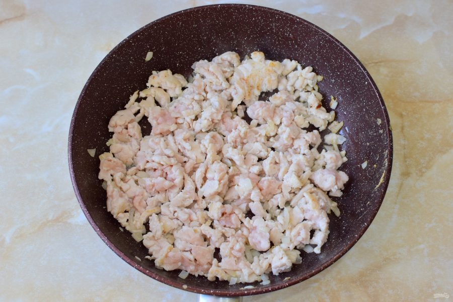 Затем добавьте в сковороду фарш индейки. Обжарьте все вместе 7-10 минут. До готовности жарить не обязательно. Достаточно только, чтобы фарш поменял цвет.