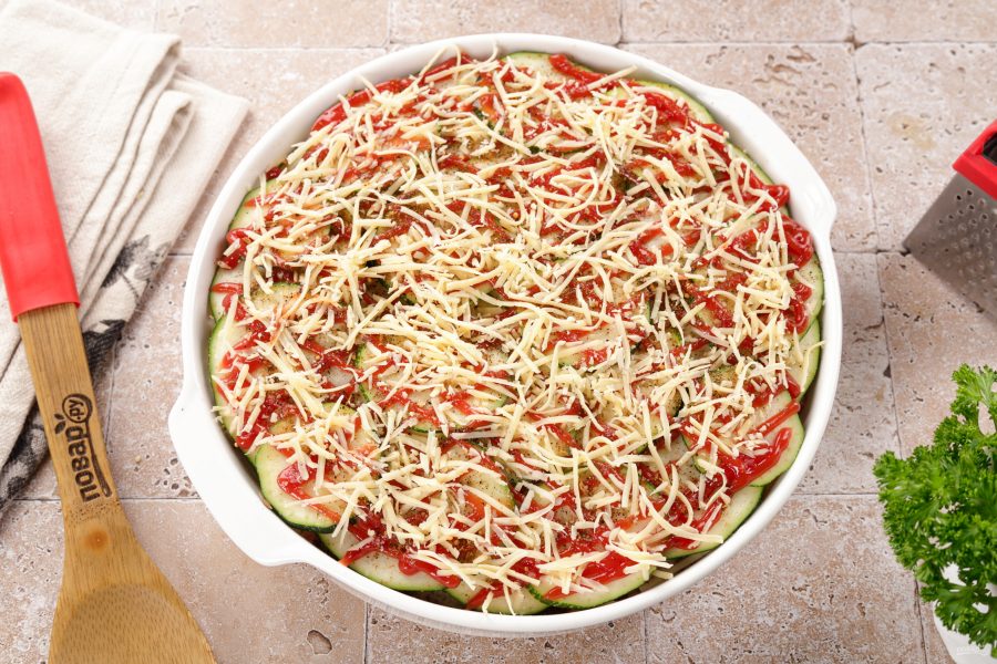 Кабачки посолите, поперчите, смажьте соусом и посыпьте тёртым сыром. Томатный соус можно заменить на сметану или майонез.