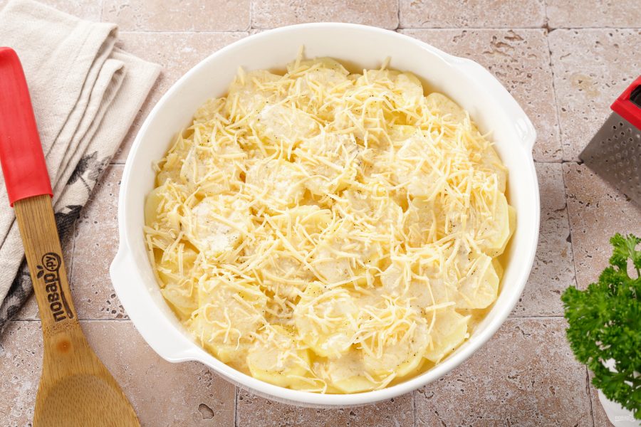Полейте всё оставшейся яично-сметанной смесью и посыпьте оставшимся сыром. Накройте форму фольгой и запекайте при температуре 200 градусов около 40 минут.
