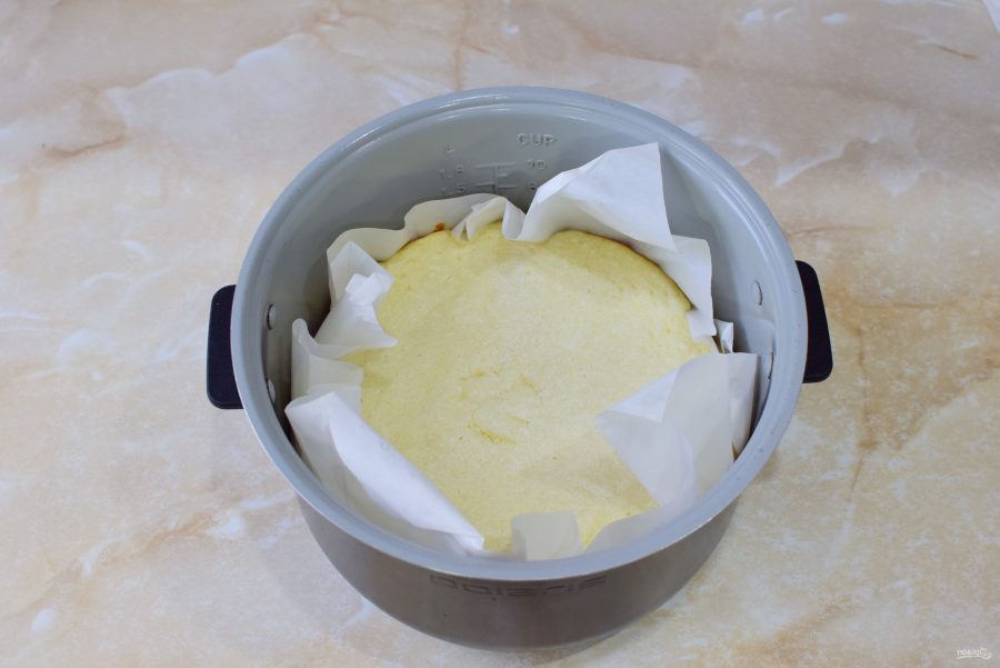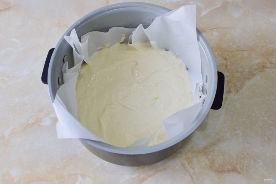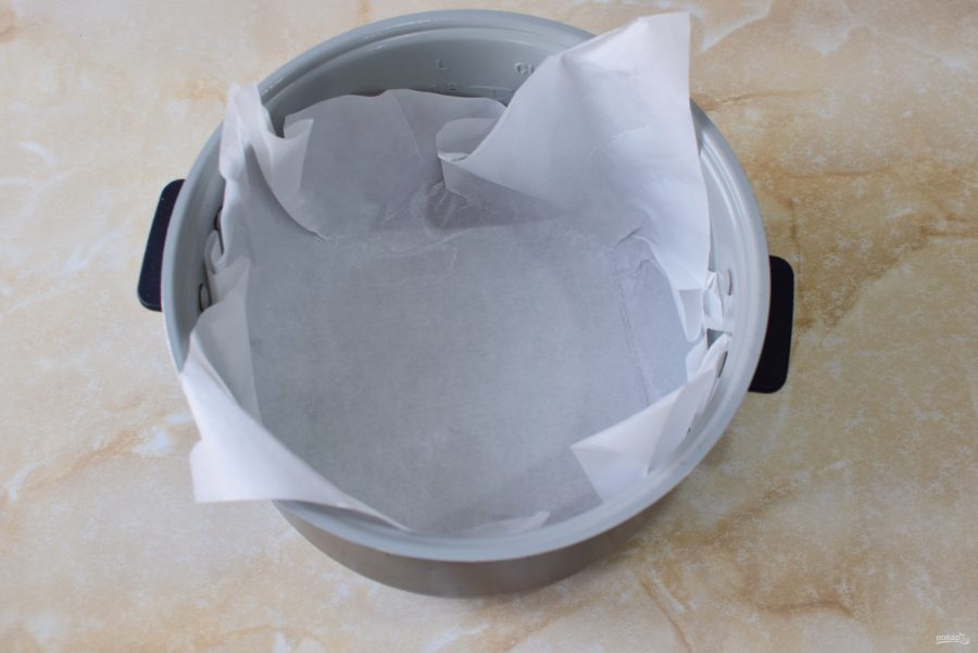 В чашу мультиварки выложите лист пергамента. Это удобно для того, чтобы потом легко извлечь готовую запеканку.