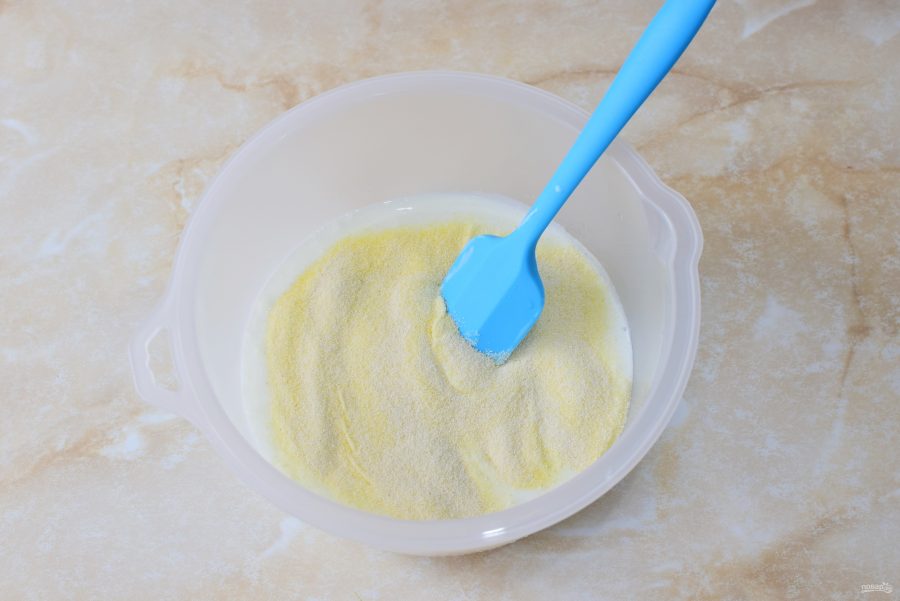 Манку смешайте с кефиром и оставьте постоять на 15-20 минут, чтобы она набухла.
