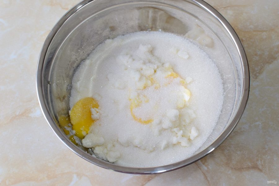 В отдельной чаше смешайте творог с яичными желтками и сахаром.