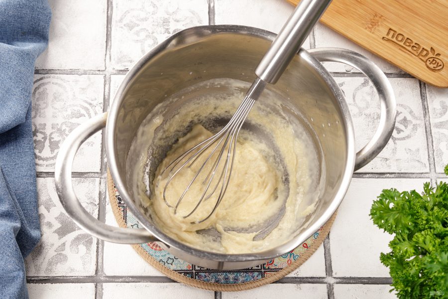 Энергично перемешайте все ингредиенты до однородности, при этом не снимая кастрюльку с огня. Таким образом мы завариваем муку, чтобы избавиться от характерного мучного привкуса.