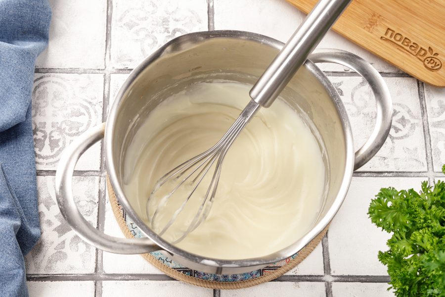 На данном этапе приготовления соуса Бешамель получается однородная густая масса, которая по консистенции напоминает манную кашу.