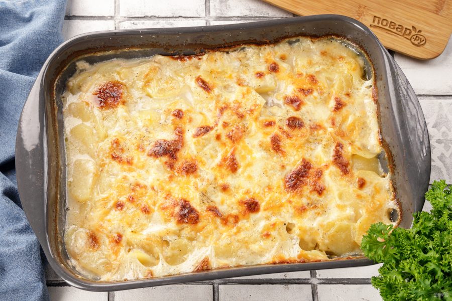 Накройте форму фольгой и готовьте при 200 градусов около 40 минут (ориентируйтесь на готовность картофеля), затем фольгу уберите и готовьте ещё 10-15 минут, чтобы верх подрумянился.