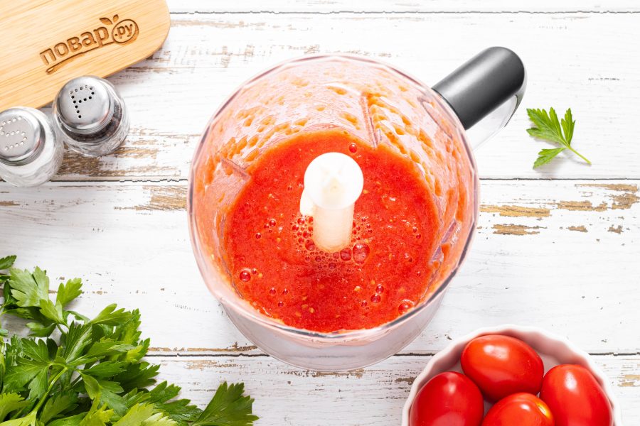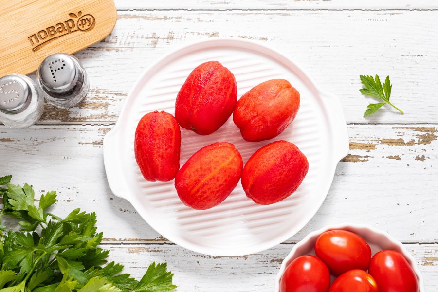 На помидорах сделайте надрез крест-накрест, опустите их в кипяток на пару минут. Затем сполосните холодной водой. Очистите помидоры от кожицы, удалите плодоножки.