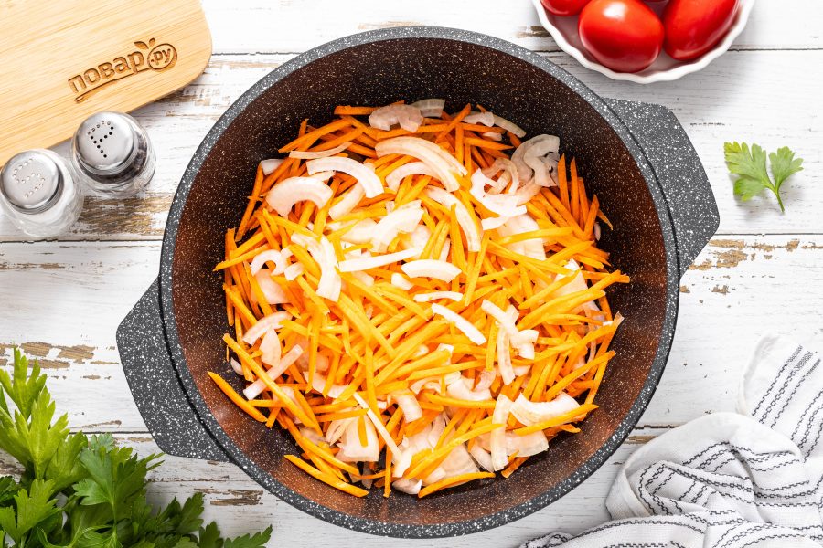 Разогрейте кастрюлю с толстым дном, обжарьте морковь и репчатый лук с растительным маслом до прозрачности и золотистого цвета.