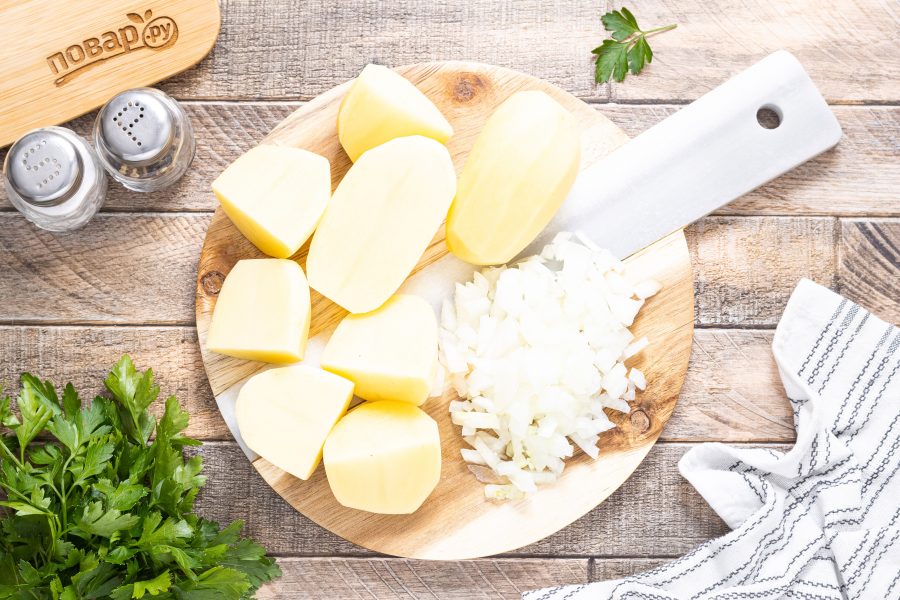 Картофель помойте, очистите от кожуры. Разрежьте на 2-4 части. Репчатый лук нарежьте на мелкие кубики.