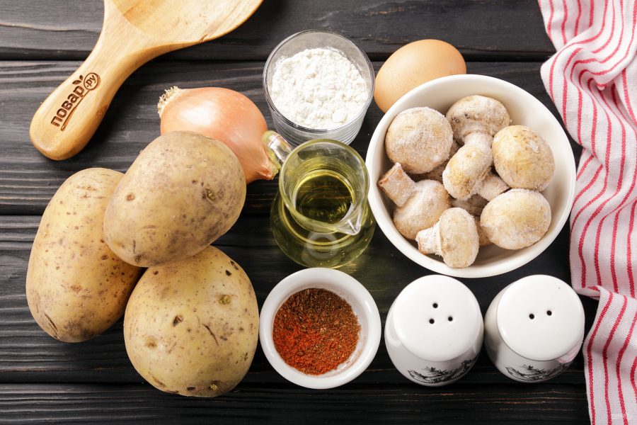 Подготовьте все ингредиенты по списку. Сыр я решила добавить в процессе, можно приготовить как с ним, так и без него. Из специй я взяла паприку, молотый перец и готовую смесь для картофеля. Грибы берите те, что больше любите.